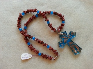 A beautiful blue and copper Murano Glass cross is suspended by a silvertone clase and paired with a necklace of Goldstone chips and blue glass beads.