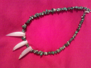 Here I've used Malachite chips for the body of the necklace and three fine quality Agate "teeth" for effect. The Agate pieces are almost translucent and pick up a lot of color which I find very intriguing.