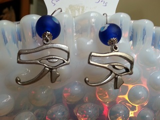 Two pewter eyes representing the "Alll seeing Eyes of Ra" are set below frosted Blue Glass beads with Greek "evil eye" protection symbols painted on them. Whether you believe or not, you're covered both ways. ;)